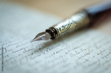 Fountain pen on an antique handwritten letter. Vintage nib pen and handwritten english font copperplate, spencerian. Old history background. Retro style.