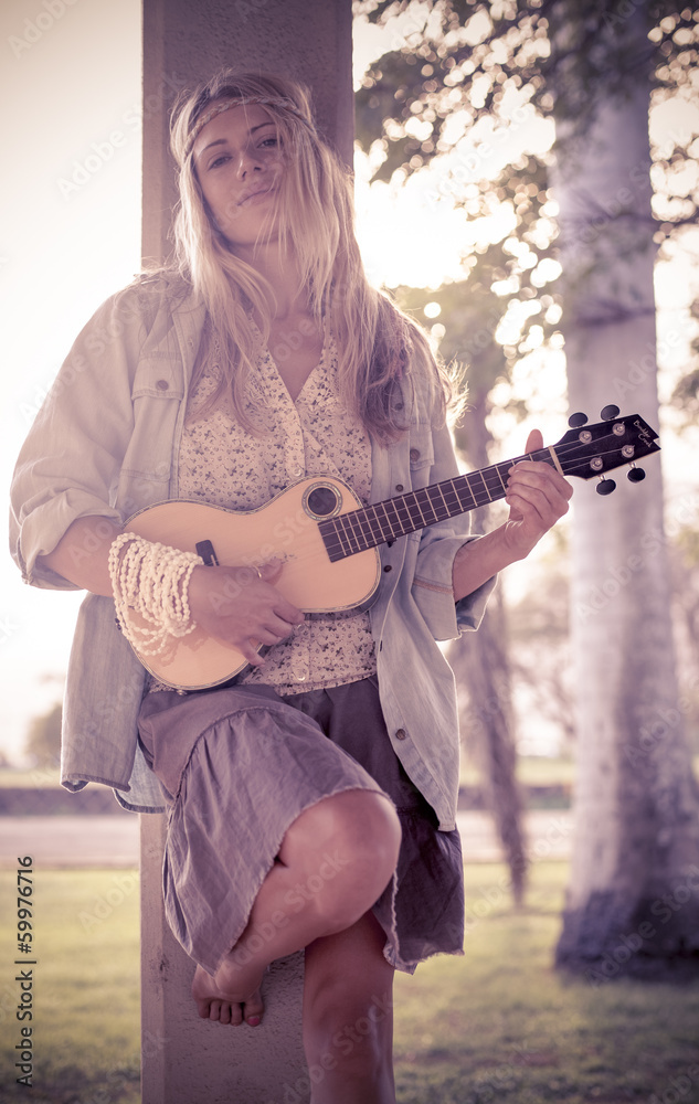 Hippie Mädchen mit Gitarre Ukulele