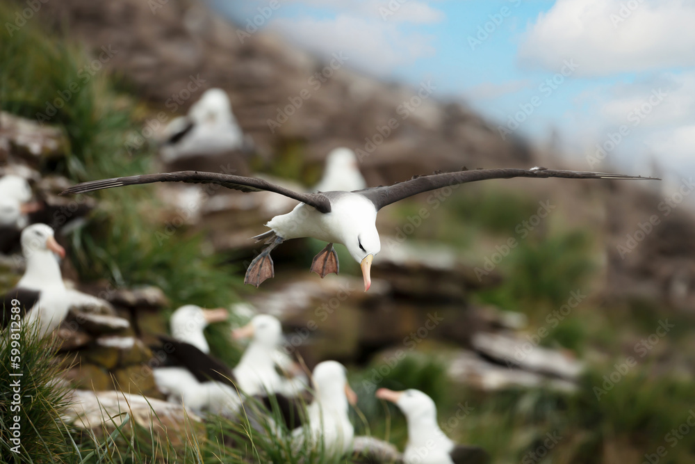 Black-browed Albatrosses in flight over colony of albatrosses in the Falkland Islands