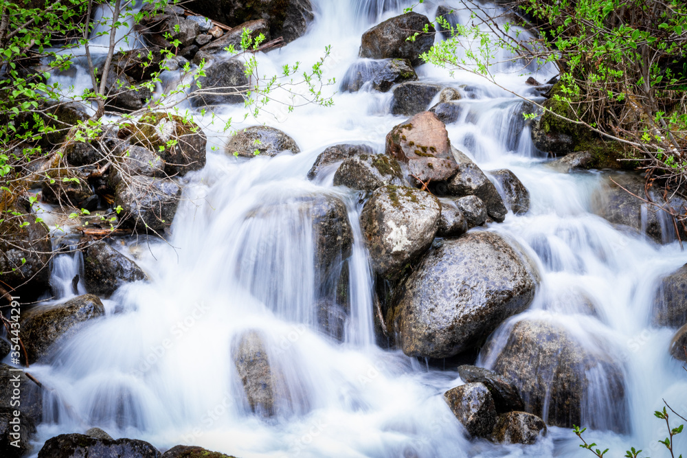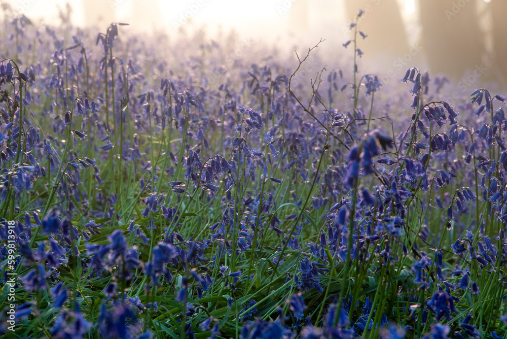 Lovely Spring bluebell forest with light layer of fog giving calm peaceful feeling in English countryside
