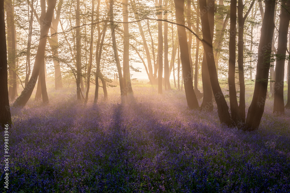 Lovely Spring bluebell forest with light layer of fog giving calm peaceful feeling in English countryside