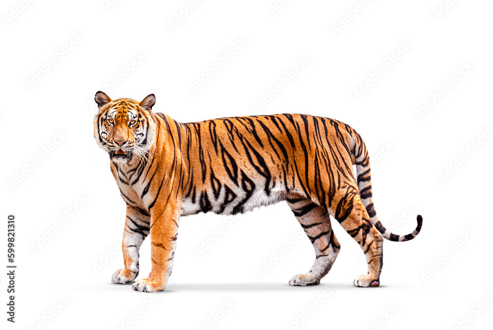 royal tiger (P. t. corbetti) isolated on white background clipping path included. The tiger is staring at its prey. Hunter concept.