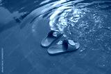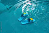 Blue pool sandals float in the water of a swimming pool. Summer concept.