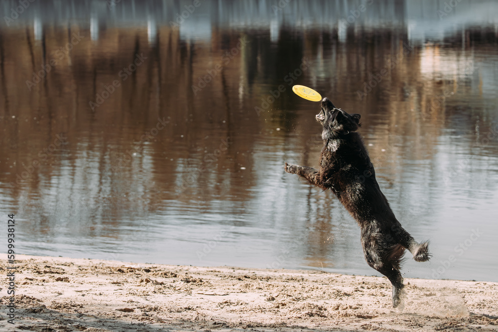 Alsatian Wolf Dog Or Black German Shepherd Dog Playing Outdoor With Flying Disc. Playful Pet Outdoors. Leisure Game For Pets. German Shepherd Dog Jumping Outdoor. Happy Pets Concept.