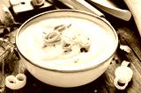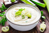 Leek Soup, Comfort Meal, Potato and Leek Creamy Soup, Vegetarian Food on Wooden Background