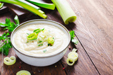 Leek Soup, Comfort Meal, Potato and Leek Creamy Soup, Vegetarian Food on Wooden Background
