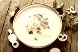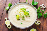 Leek Soup, Comfort Meal, Potato and Leek Creamy Soup, Vegetarian Food on Wooden Background