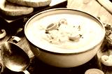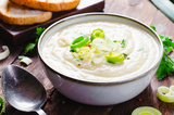 Leek Soup, Comfort Meal, Potato and Leek Creamy Soup, Vegetarian Food on Wooden Background