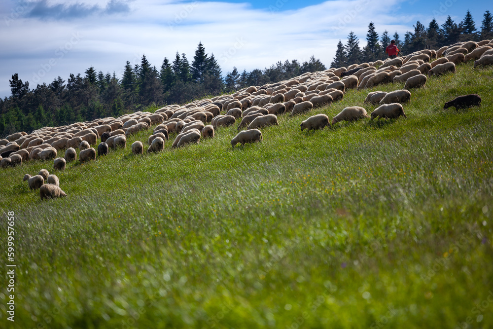 Bacówka w Czarnem i okolice w Beskidzie Niskim. Stado owiec na zielonym pastwisku.