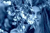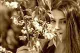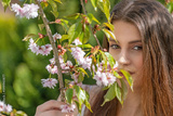 Attractive brunette girl posing on camera partially covered by a sprig of cherry blossoms. Horizontally.