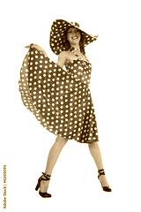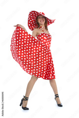 portrait redheaded with spotted dress on white background