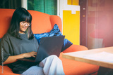 asian teenager using laptop computer by typing for internet communicate at home living room