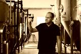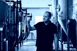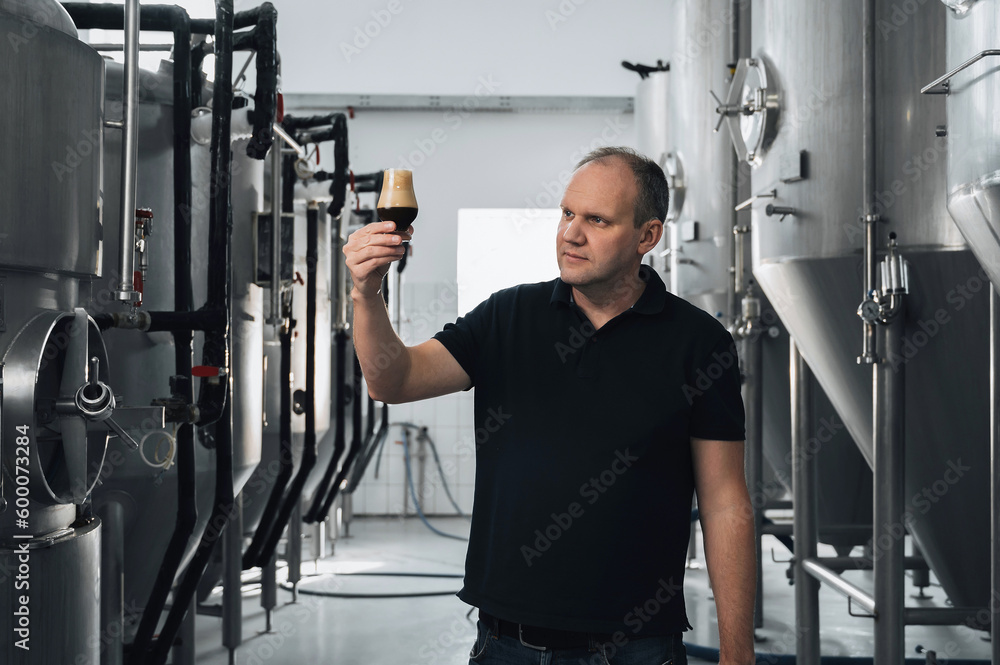 brewer at brewery checks the quality with a glass of fresh beer