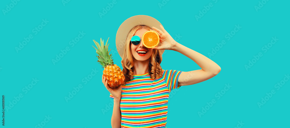 Summer portrait of happy smiling young woman with pineapple and slice of orange, fresh tropical juicy fruits, wearing straw hat, sunglasses on blue background