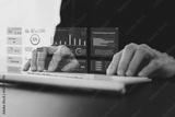 Analyst computer working with information database to analysis marketing sale data. Business project or program strategy planning and development for corporate operating finance and investment concept