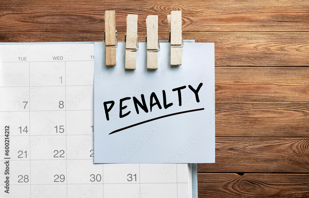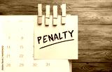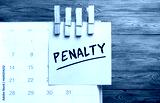 Blue sticker attached to a calendar on a wooden background with text PENALTY