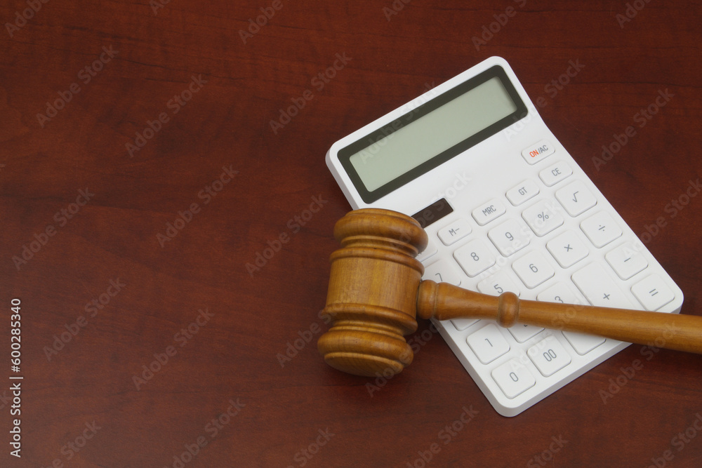Judge gavel and white calculator on wooden table. Copy space for text.