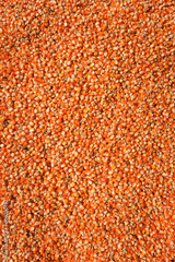 full frame top view Raw dried corn seeds or corn kernels drying in the sun on the ground.