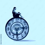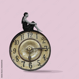 Sad girl on the background of vintage clock, pink background, transience of time, deadline, surreal, art, fashion collage, physiology and mental health
