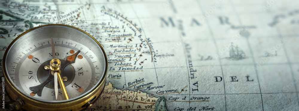 Magnetic old compass on world map. Travel, geography, navigation, tourism and exploration concept background.