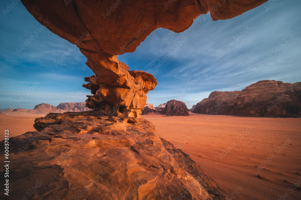 Rock formations in the red desert of Wadi Rum in Jordan - captured in the golden hour