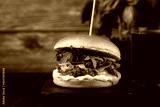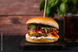 Homemade burger or hamburger, made with beef, cheese, fried bacon, vegetables, sun-dried tomatoes and caramelized onions, mayonnaise, rocket salad, sliced bun. Glass of beer, basil plant.