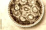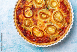 Quiche with leek or leekraine, chicory, egg, pecorino cheese and cream. Homemade savory pie, oven baked. Vegetarian food. Top view, closeup, light blue background.