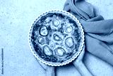 Hands holding homemade Quiche leekraine with leek, egg, pecorino cheese and heavy cream. Savory pie, oven baked. Vegetarian food. Top view, beige background.