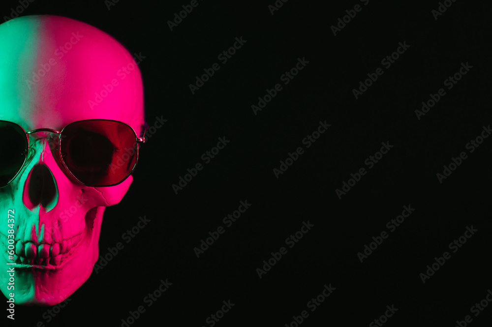 human skull wearing sunglasses with pink green neon light on a black background