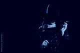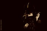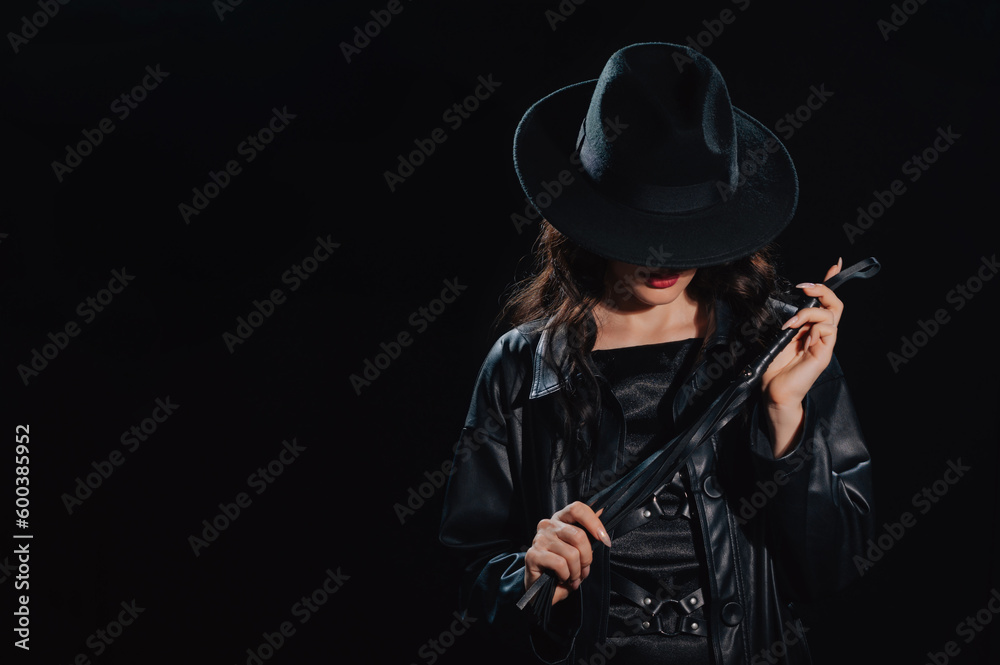 Sexy female dominant mistress with whip for BDSM sex with submission and domination in a leather raincoat and hat in noir style on dark background