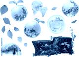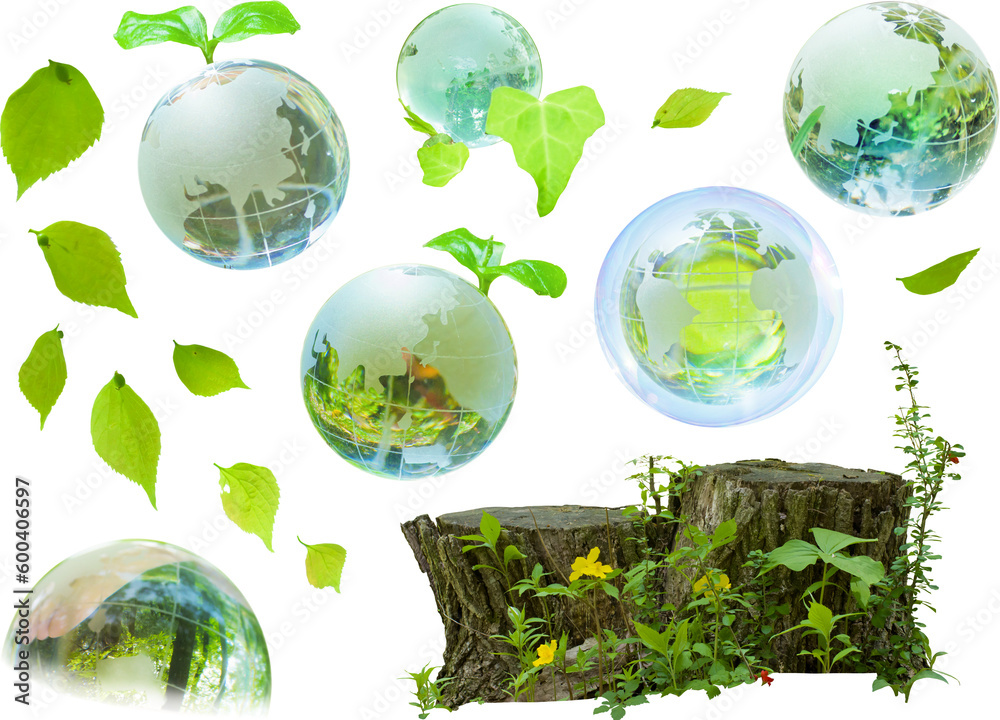 切り抜き透過素材セットーエコ(緑の地球儀と切り株と葉)