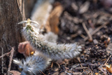 Dry fruits of willow buds on the ground close-up.