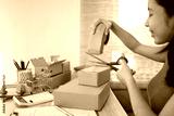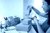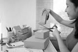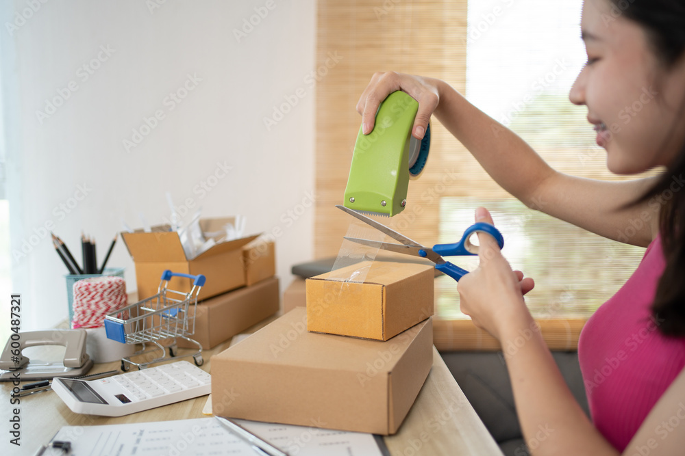Woman packing items into a post box to prepare for delivery to a customer, Working at home and owning businesses, Online shopping SME entrepreneur, packing box, Sell online, freelance working.
