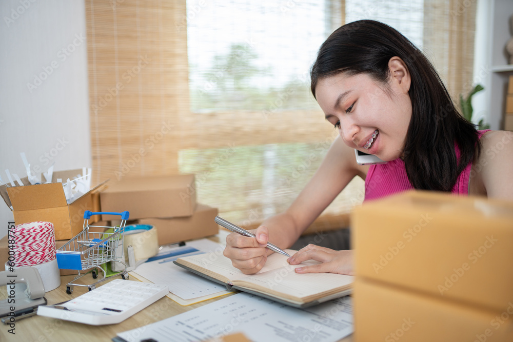 Online shopping business owner is talking on the phone with a customer to jot down the delivery address and delivery schedule, SME entrepreneur online shopping, Packaging box Sell online.