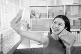 Woman uses his phone to take pictures of himself with products or selfies, Identity verification or order confirmation, Business style for working at home, Working at home and owning businesses.