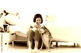 Young Asian woman playing with three dogs (brown shiba inu, white shiba puppy and white maltese)in bedroom. Cheerful and nice couple with people and pet. Pet Lover concept.