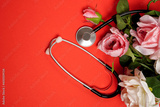 Bunch of rose flowers and stethoscope on bright red background. National Doctor's day. Happy nurse day. Top view with copy space