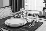 Table served in modern stylish dining room, dinner plate setting. Top view.