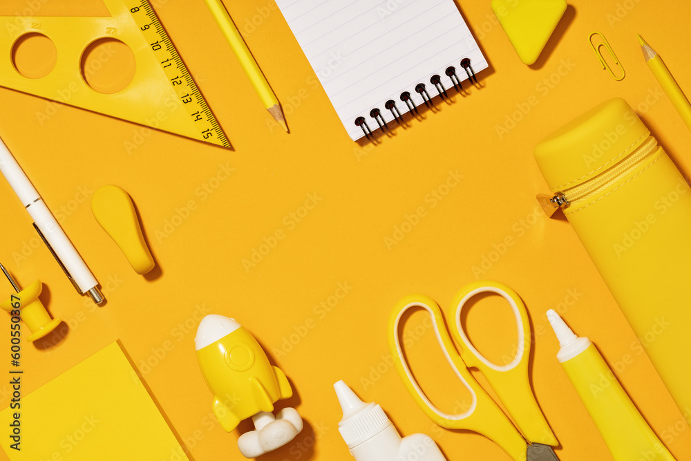 Assorted office and school white and yellow stationery. copy space for back to school or education craft office work concept. Bright Yellow monochrome scissors, rocket notepad. Achievement and success