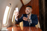 young asian businessman is sitting in private luxury jet and communicate via smartphone video call