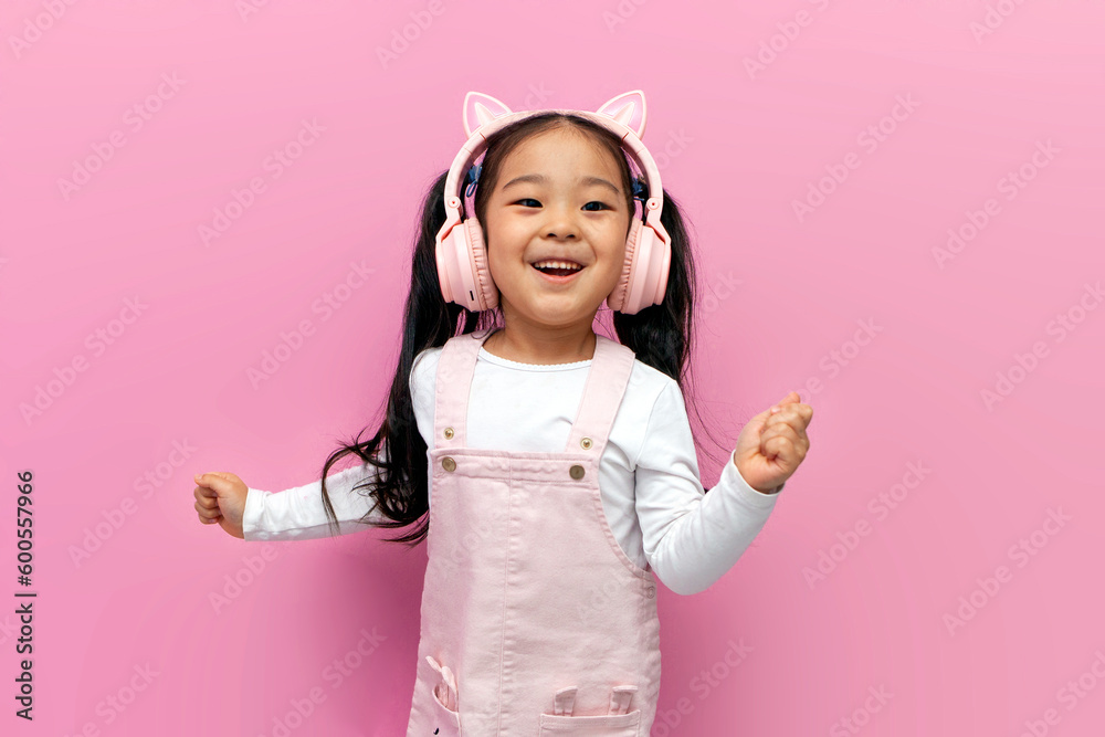 little asian girl in pink children's headphones listens to music and dances on pink isolated background, korean child