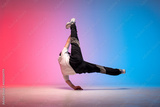 dancer doing acrobatic trick and dancing breakdance in neon red and blue lighting