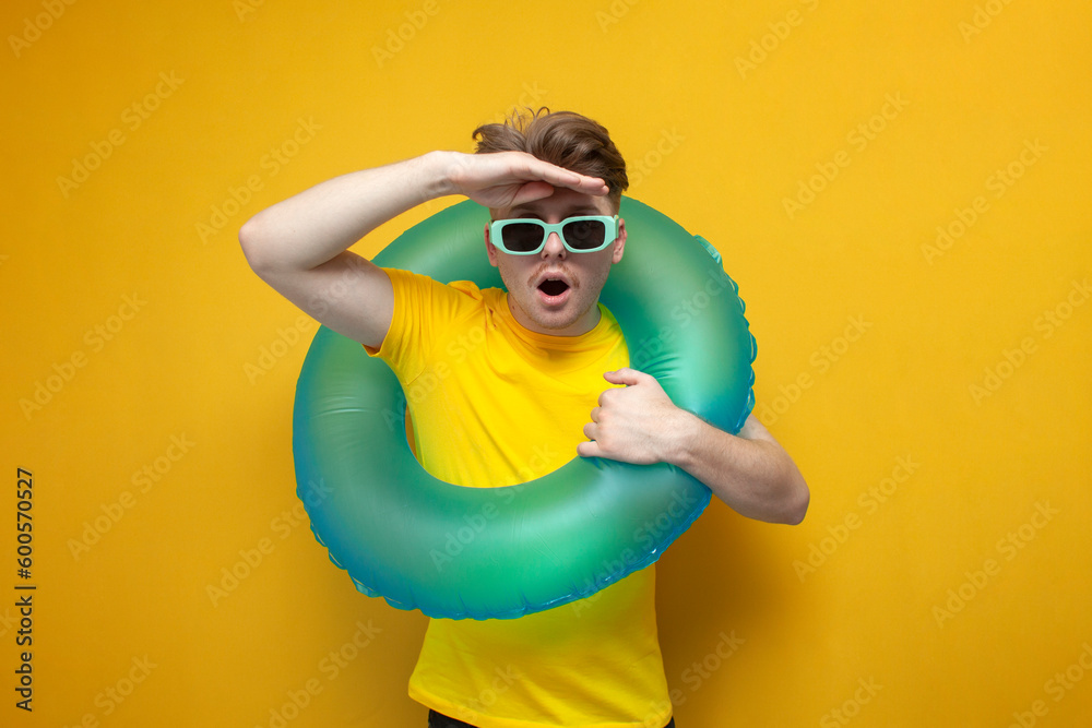 guy in summer clothes with a swimming inflatable ring looks into the distance, the concept of traveling to the sea