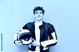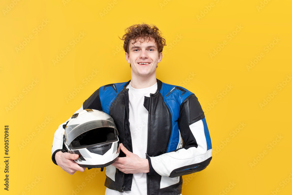 young guy motorcyclist in leather jacket holds helmet and smiles on yellow isolated background
