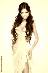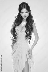 Beautiful brunette woman wearing in sexy luxury dress over pink