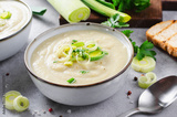 Leek Soup, Comfort Meal, Potato and Leek Creamy Soup, Vegetarian Food on Bright Background