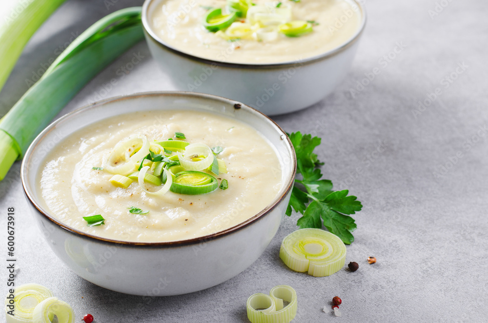 Leek Soup, Comfort Meal, Potato and Leek Creamy Soup, Vegetarian Food on Bright Background