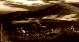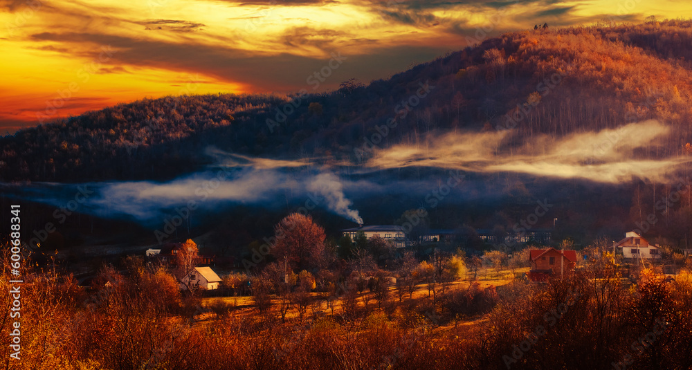 Smoke from the kitchen chimney over the autumn village, Fantanele village, Sibiu county, Romania