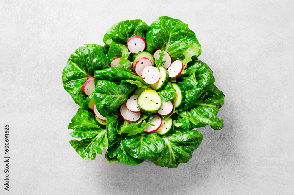 Fresh Salad with Radish, Cucumber and Lettuce on Bright Background, Healthy Vegetarian Food