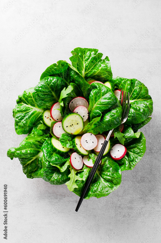 Fresh Salad with Radish, Cucumber and Lettuce on Bright Background, Healthy Vegetarian Food